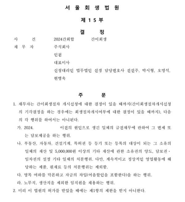 서울회생법원 법인회생 신청사건의 보전처분결정문
