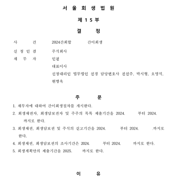 서울회생법원 법인회생 개시결정문