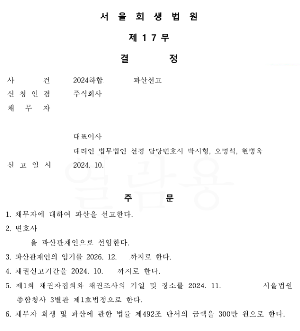 서울회생법원 법인파산 신청사건의 파산선고결정문
