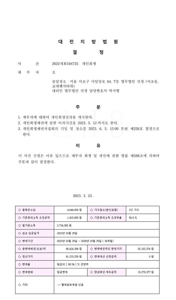 개인회생신청사건의 개시결정문