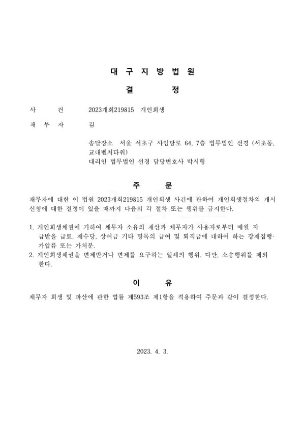개인회생신청사건의 금지명령결정문