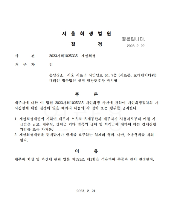 개인회생신청사건의 금지명령결정문