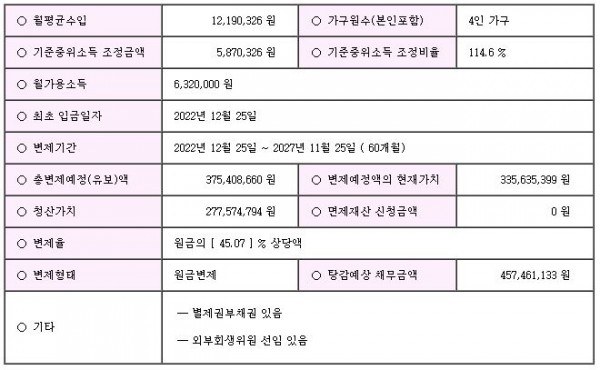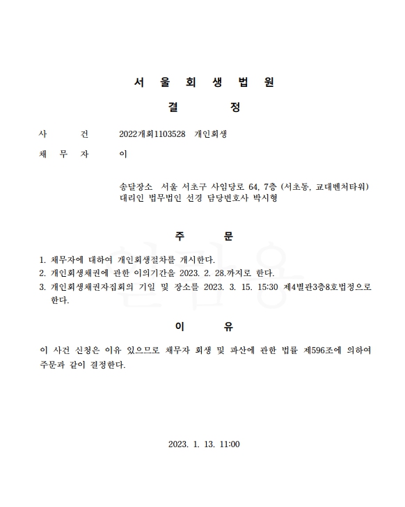 개인회생신청사건의 개시결정문