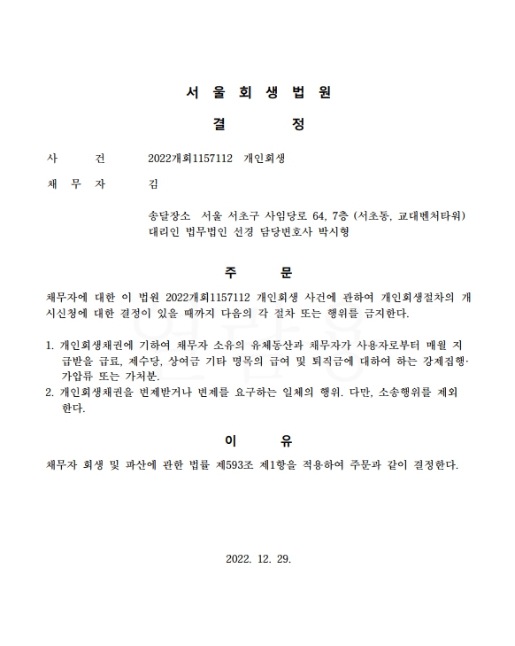 개인회생신청사건의 금지명령결정문