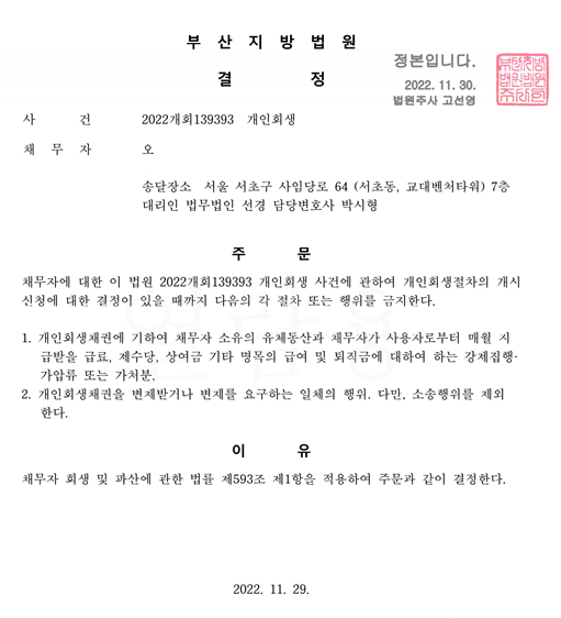 개인회생신청사건의 금지명령결정문