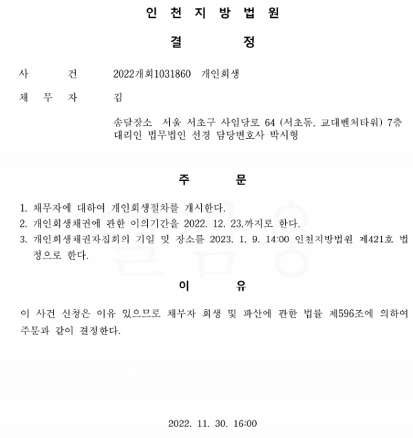 개인회생신청사건의 개시결정문