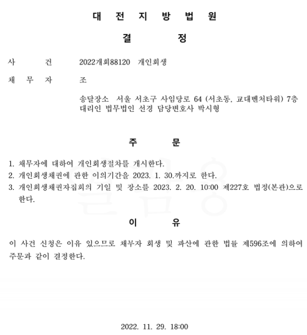 개인회생신청사건의 개시결정문