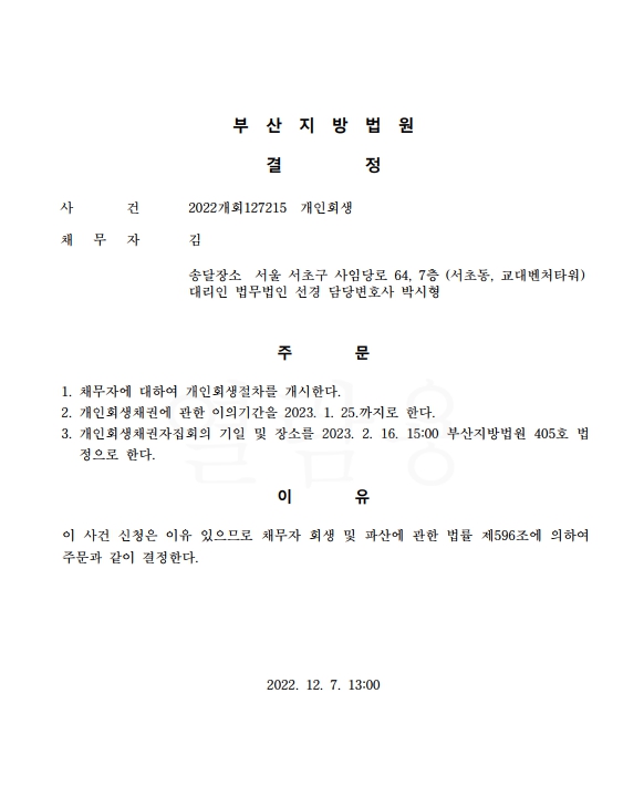 개인회생신청사건의 개시결정문