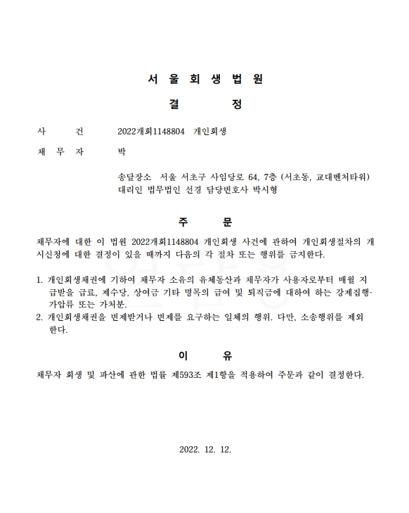 개인회생신청사건의 금지명령결정문