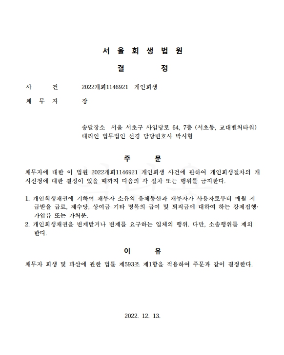 개인회생신청사건의 금지명령결정문