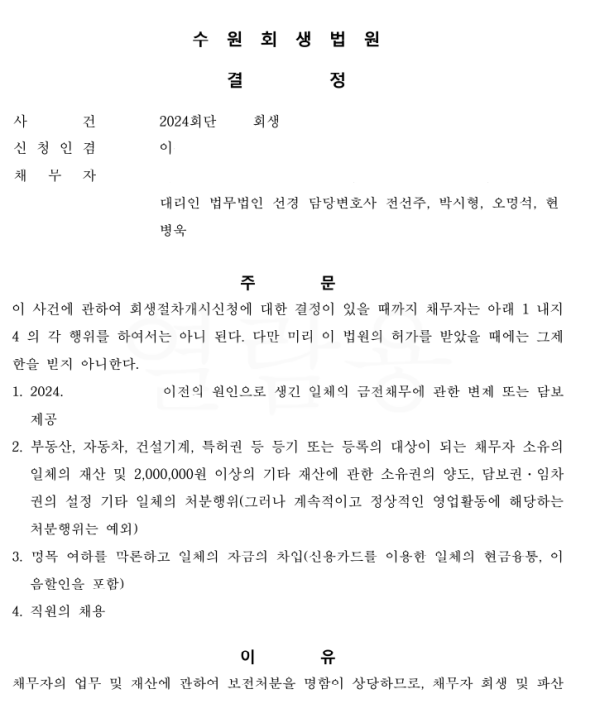 수원회생법원 일반회생 신청사건의 보전처분결정문