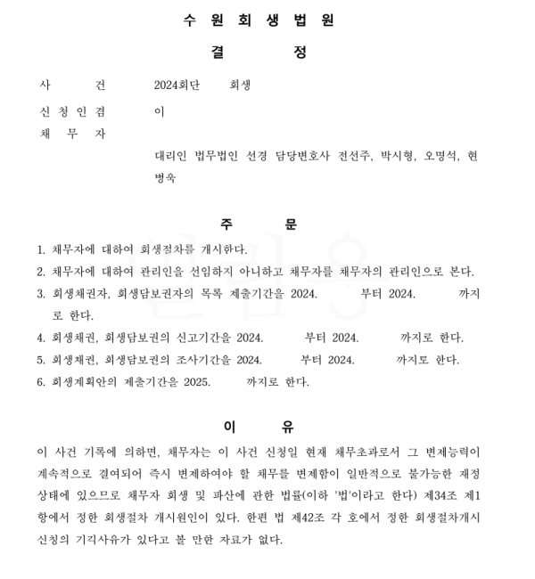 수원회생법원 일반회생 신청사건의 개시결정문