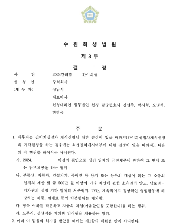 수원회생법원 법인회생 신청사건의 보전처분결정문