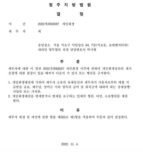 개인회생신청사건의 금지명령결정문