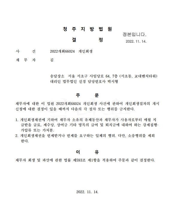 개인회생신청사건의 금지명령결정문