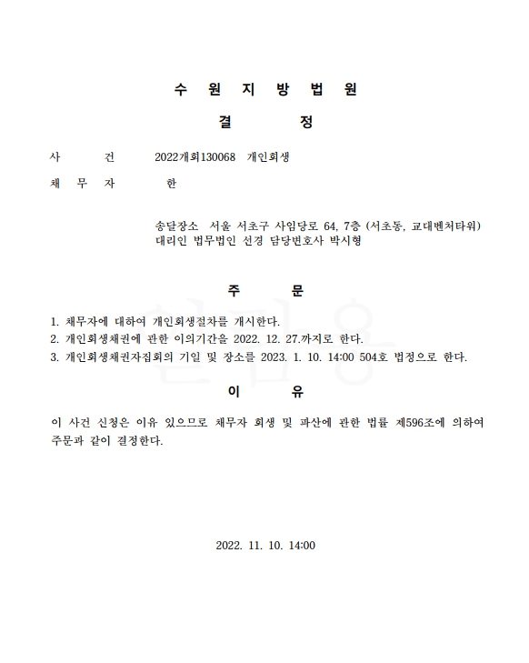 개인회생신청사건의 개시결정문