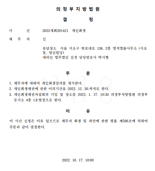 개인회생신청사건의 개시결정문