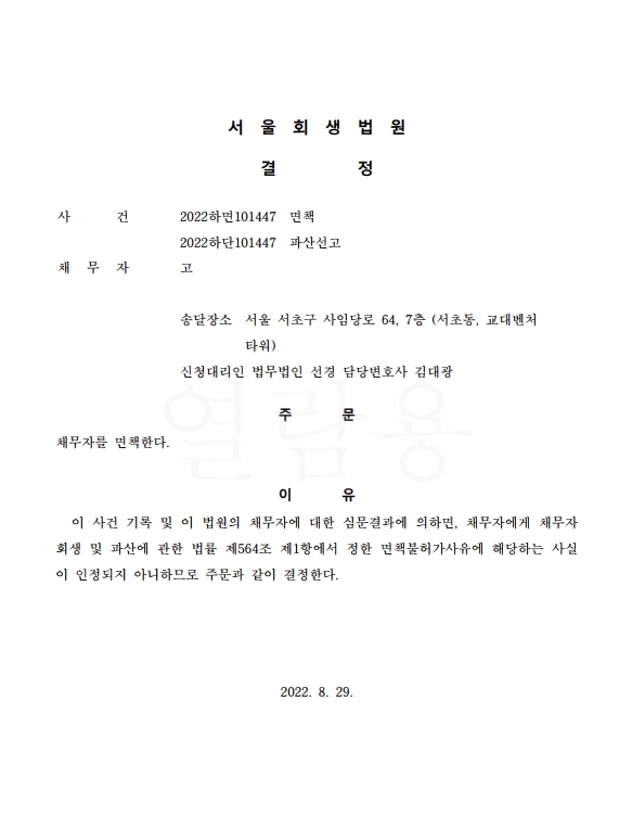 개인파산신청사건의 면책결정문