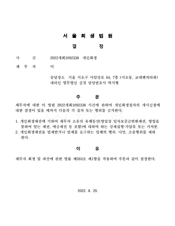 개인회생신청사건의 금지명령결정문