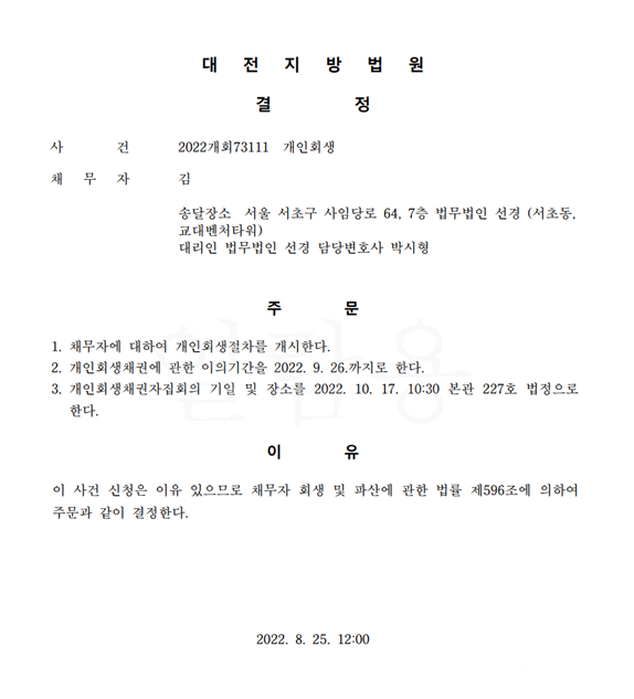 개인회생신청사건의 개시결정문
