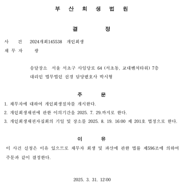 개인회생신청사건의 개시결정문