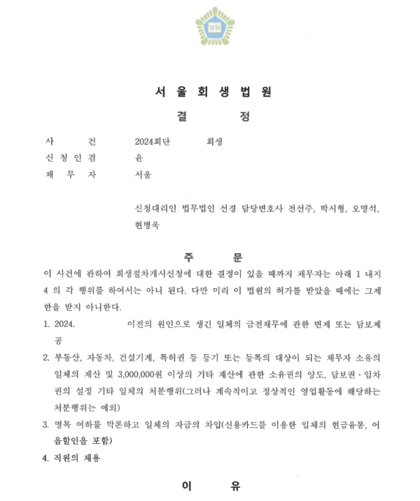 서울회생법원 일반회생 신청사건의 보전처분결정문