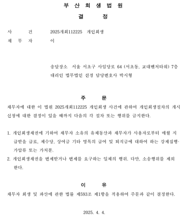 개인회생신청사건의 금지명령 결정문