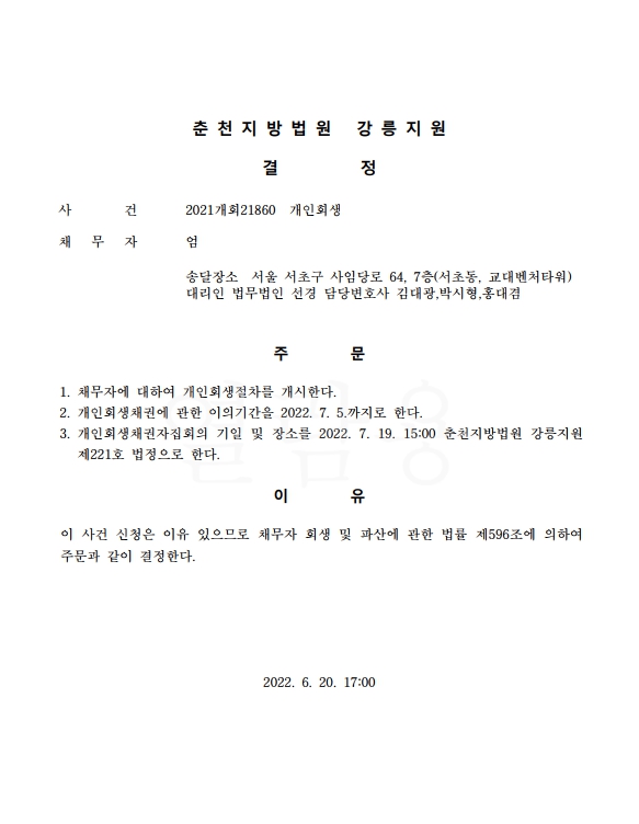 개인회생 개시결정 페이지 정보 최고관리자 작성일22-06-21 목록 본문 2022. 6. 춘천지방법원 강릉지원개인회생신청사건의 개시결정문변제율 원금 28.80% 변제기간 60개월 목록