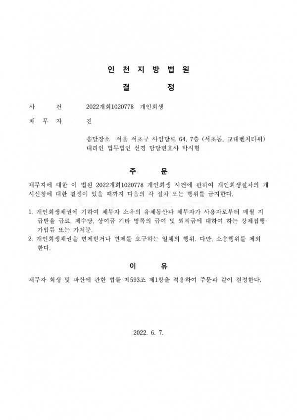 개인회생신청사건의 금지명령결정문