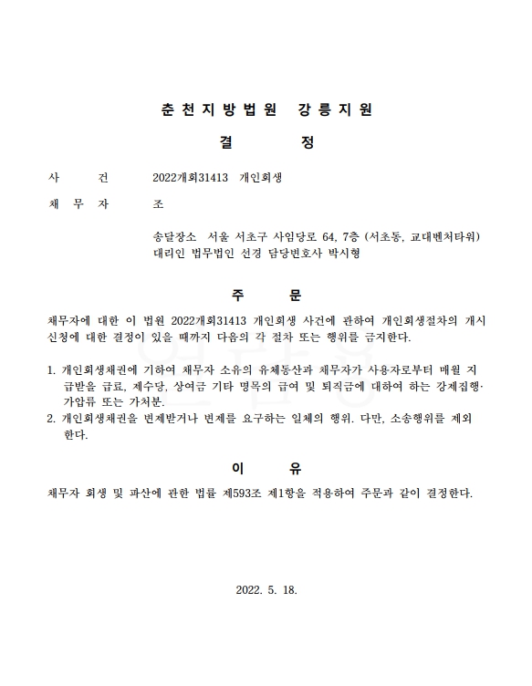 개인회생신청사건의 금지명령결정문