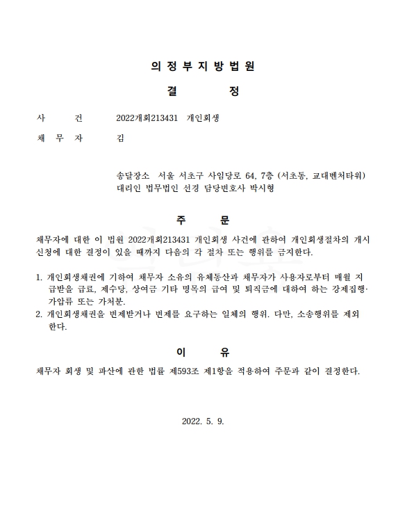 개인회생신청사건의 금지명령결정문