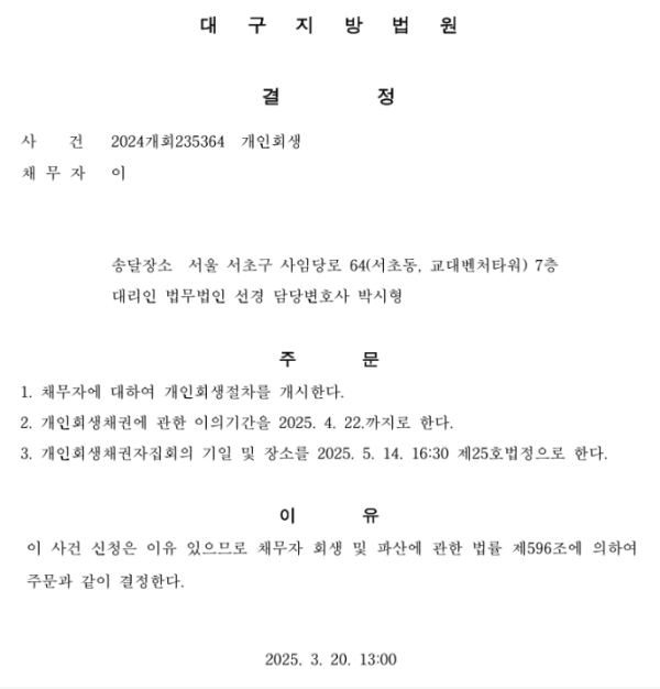 개인회생신청사건의 개시결정문