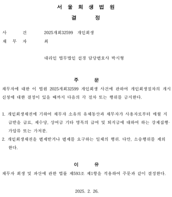 개인회생신청사건의 금지명령 결정문