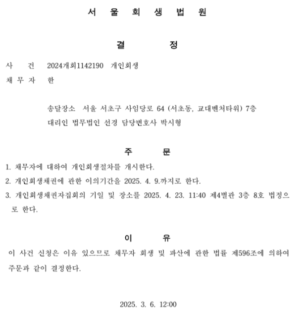 개인회생신청사건의 개시결정문