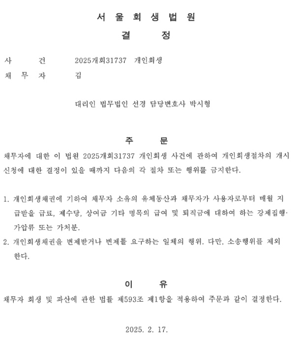 개인회생신청사건의 금지명령 결정문
