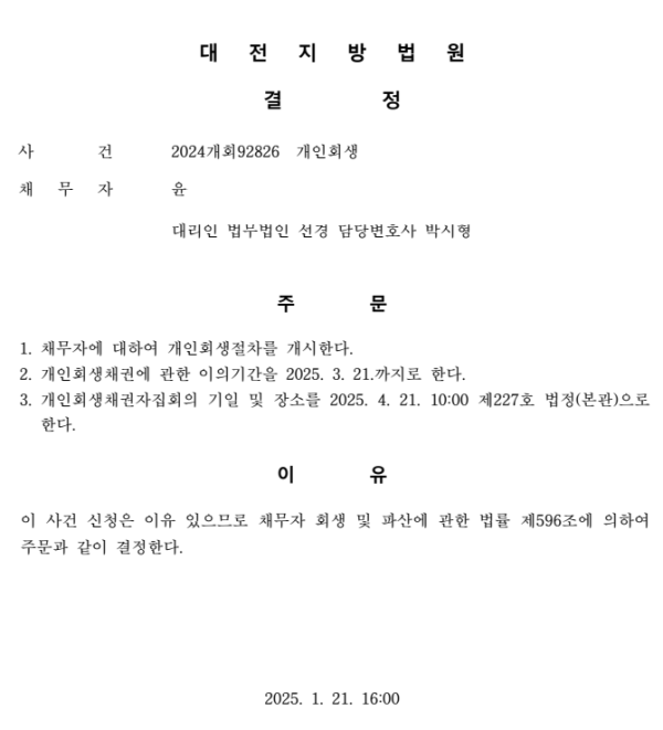 개인회생신청사건의 개시결정문