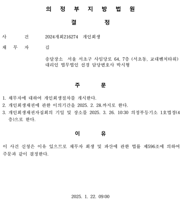개인회생신청사건의 개시결정문