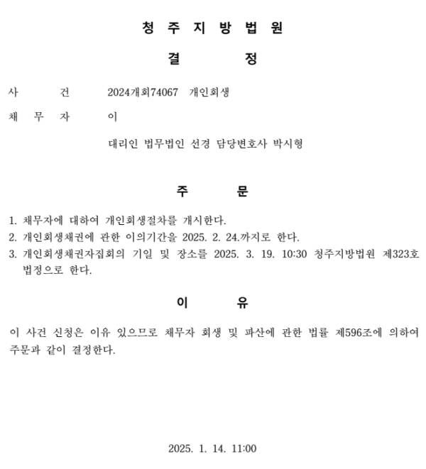 개인회생신청사건의 개시결정문