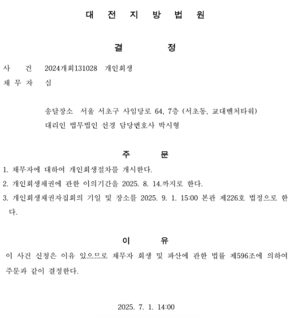 개인회생신청사건의 개시결정문