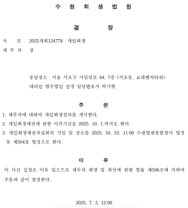 개인회생신청사건의 개시결정문