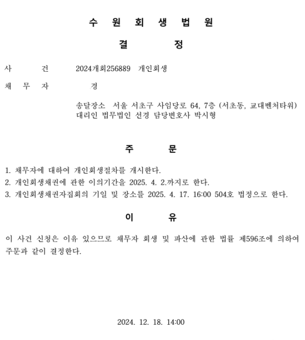 개인회생신청사건의 개시결정문