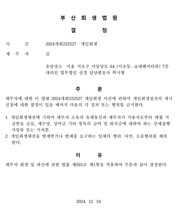 개인회생신청사건의 금지명령결정문