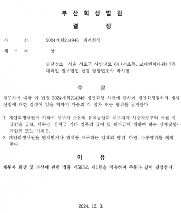 개인회생신청사건의 금지명령결정문