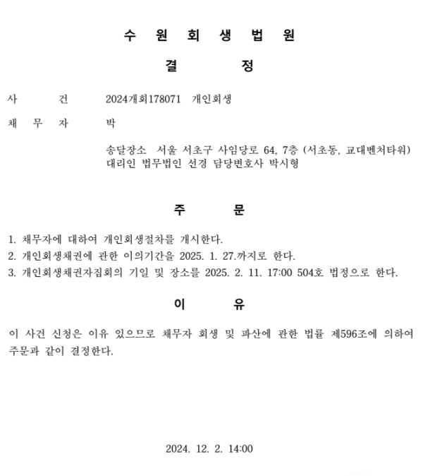 개인회생신청사건의 개시결정문