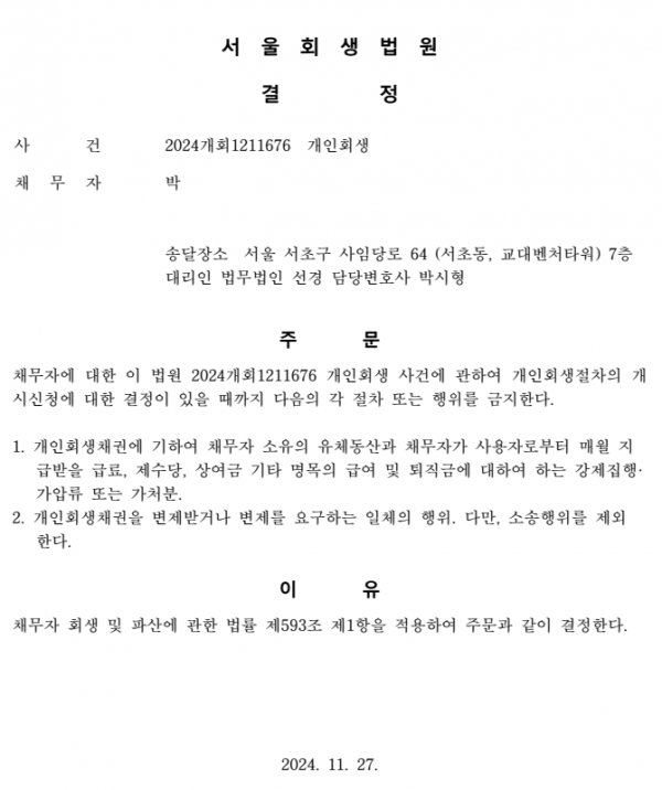 개인회생신청사건의 금지명령결정문