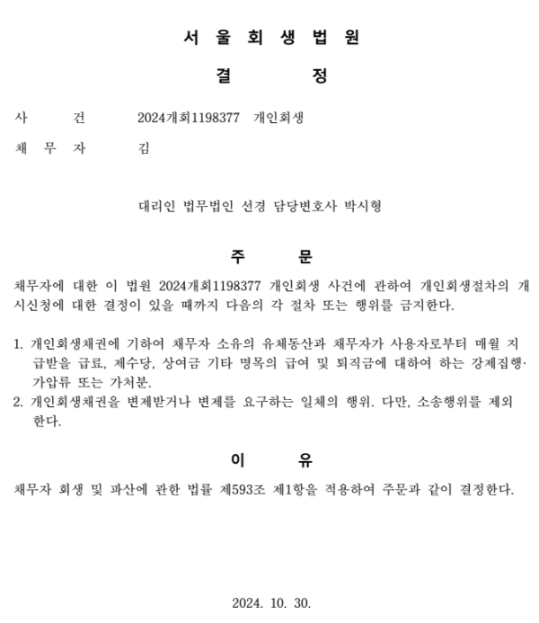 개인회생신청사건의 금지명령결정문