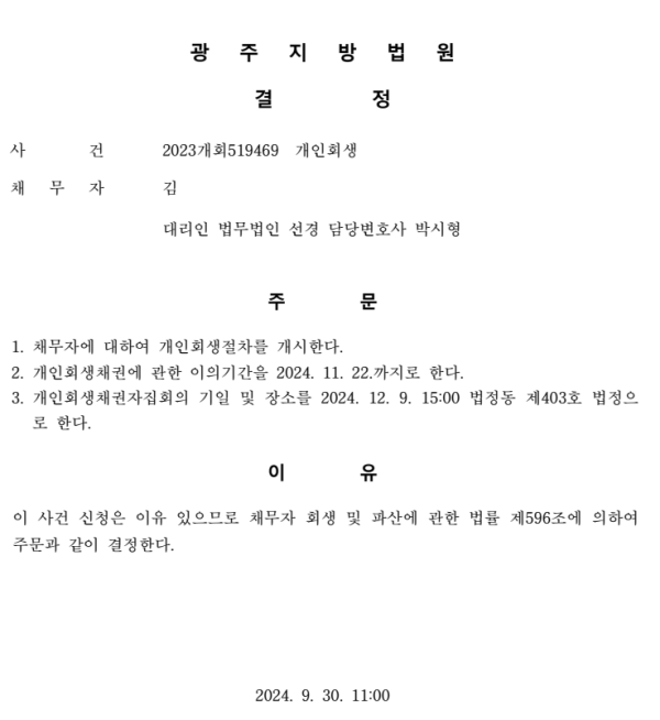 개인회생신청사건의 개시결정문