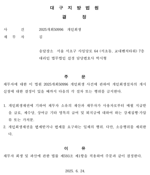 개인회생신청사건의 금지명령 결정문