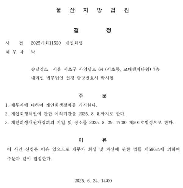 개인회생신청사건의 개시결정문