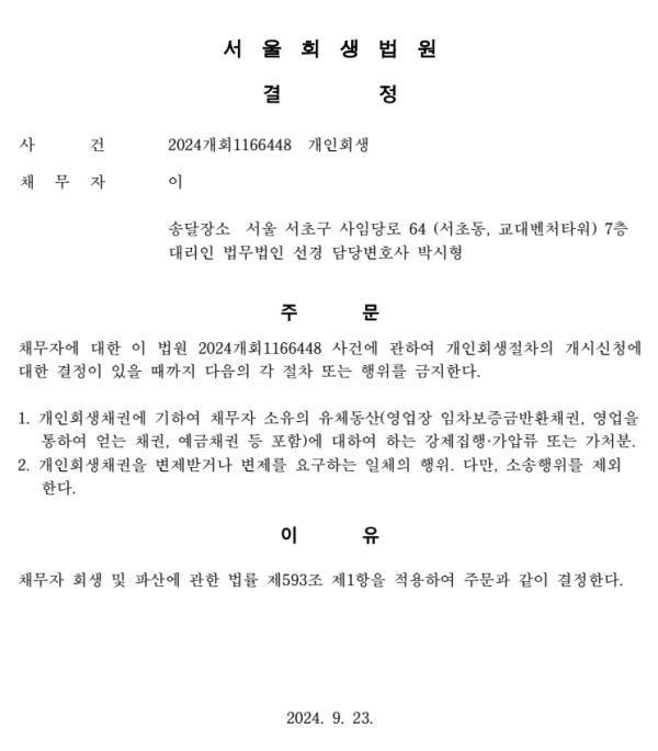 개인회생신청사건의 금지명령결정문